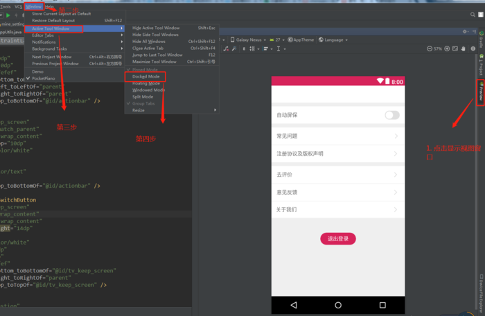 前阵子用 AndroidStudio,不知道点错了什么按钮,preview 视图窗口不是固定在一侧。只要点击 xml 界面,就隐藏了 preview 窗口,根本开发不了。找来找去,发现设置处没有docked mode属性。