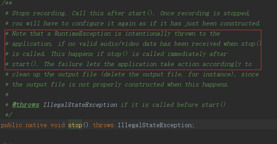经过以上步骤 prepare 之后,当再次调用 MediaRecorder.start() 就可以开始录屏了,这里同意也需要注意的时,调用 start() 方法开始录屏之后,不能立即调用 stop()方法停止录屏,否则会奔溃。测试在测试录屏功能时立马停止录屏,应用奔溃,一直找不到原因。直到看到了源码( API 26 )里的注释