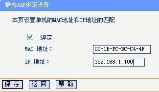 填入电脑的MAC地址与对应的IP地址,然后保存,就实现了IP与MAC地址绑定。