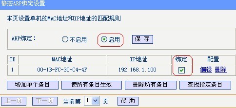 注意:默认情况下ARP绑定功能是关闭,请选中启用后,点击保存来启用。