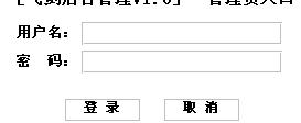 | 以下是代码片段: <table width="755" border="0" align="center" cellspacing="1" style="font-size:13px; "> <form name="form1" method="POST" action="check.asp"> <tr align="center" bgcolor="#eeeeee"> <td height="35" colspan="2" style="font-size:15px; "><b>管理员入口</b></td> </tr> <tr bgcolor="#eeeeee"> <td width="308" align="right"><b>用户名:</b></td> <td width="440"><input name="name" type="text" class="table" id="name" size="25"></td> </tr> <tr bgcolor="#eeeeee"> <td align="right"><b>密 码:</b></td> <td><input name="pwd" type="password" class="table" id="pwd" size="25"></td> </tr> <tr bgcolor="#eeeeee"> <td colspan="2"> </td> </tr> <tr align="center" bgcolor="#eeeeee"> <td colspan="2"><input name="Submit" type="submit" class="table" value=" 登 录 "> <input name="Submit2" type="button" class="table" value=" 取 消 " onClick="javascript:window.location.href='http://www.windsn.com/'"></td> </tr> </form> </table> |