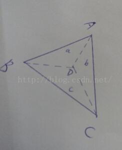 然后判断这个点是不是在某个三角形中,如果在,那就肯定在这个多边形中,那问题接下来就转化成判断这个点是不是在三角形中了,只要这个点D和三角形的三个点A、B、C组合的三角形a、b、c的面积之和等于这个三角形的面积,就说明这个点在三角形中,如图。