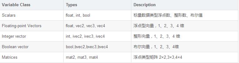 数据类型可分为标量、向量、矩阵、采样器、结构体、数组等