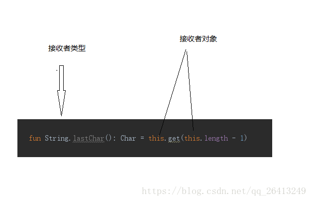 要做的,就是把要扩展的类或者接口的名称,放到即将添加的函数前面。这个类的名称被称为接收者类型;用来调用这个扩展函数的对象,叫做接收者对象。