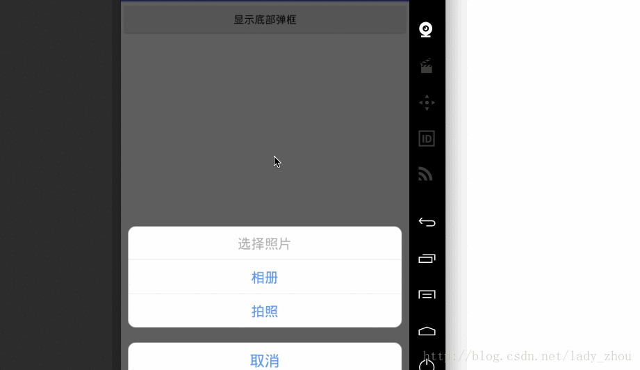 如图所示,当我封装的Dialog被触发时,从底部弹出,点击取消键整个弹框会消失,当点击不同的TextView会有相应的点击事件发生,目前只写了三个能被点击的TextView(以后会改为可以动态添加个数)。