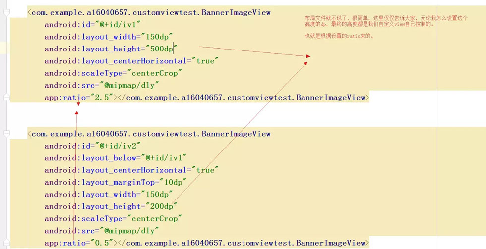这里给出一个自定义的imageview,通过设置一个ratio的属性即可动态的设置iv的高度。很是方便