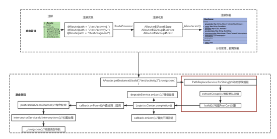 上图是根据 ARouter 一次基本的路由导航过程,整理的基本框架图,涉及到主要流程,下面进行详细介绍。