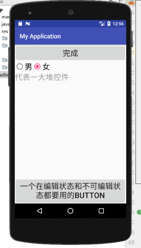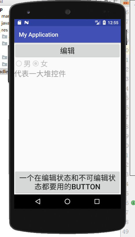 <?xml version="1.0" encoding="utf-8"?> <LinearLayout xmlns:android="http://schemas.android.com/apk/res/android" xmlns:tools="http://schemas.android.com/tools" android:id="@+id/all_views" android:layout_width="match_parent" android:layout_height="match_parent" android:orientation="vertical" tools:context=".MainActivity"> <Button android:id="@+id/edit" android:layout_width="match_parent" android:layout_height="wrap_content" android:text="编辑" android:textSize="25sp" /> <RadioGroup android:layout_width="match_parent" android:layout_height="wrap_content" android:orientation="horizontal"> <RadioButton android:id="@+id/boy" android:layout_width="wrap_content" android:layout_height="wrap_content" android:text="男" android:textSize="25sp" /> <RadioButton android:id="@+id/girl" android:layout_width="wrap_content" android:layout_height="wrap_content" android:text="女" android:textSize="25sp" /> </RadioGroup> <LinearLayout android:layout_width="match_parent" android:layout_height="wrap_content" android:layout_weight="1"> <EditText android:id="@+id/views" android:layout_width="match_parent" android:layout_height="wrap_content" android:background="@null" android:hint="代表一大堆控件" android:textSize="25sp" /> </LinearLayout> <Button android:id="@+id/special" android:layout_width="match_parent" android:layout_height="wrap_content" android:text="一个在编辑状态和不可编辑状态都要用的Button" android:textSize="25sp" /> </LinearLayout>