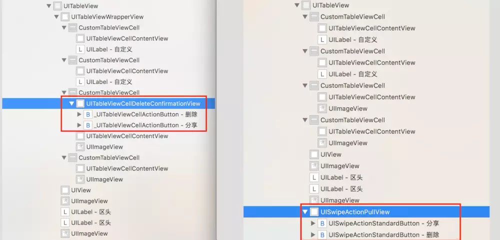 (1).iOS10下视图层次为:UITableView -> UITableViewCell -> UITableViewCellDeleteConfirmationView -> _UITableViewCellActionButton,我们所需自定义的按钮视图UITableViewCellDeleteConfirmationView(左图中红框处)是UITableViewCell的子视图。