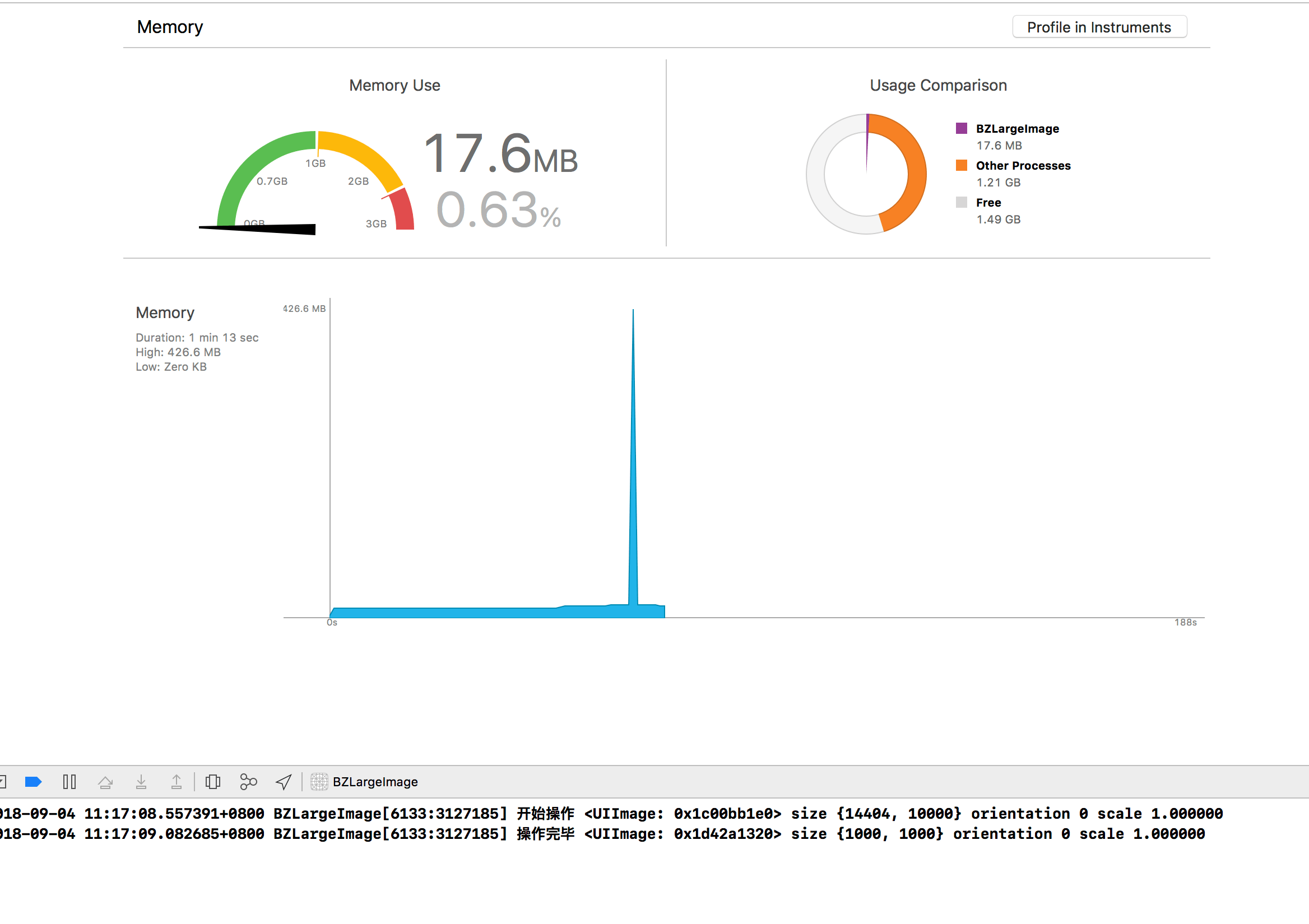 这里是内存消耗。通过看图可以发现,针对大图,在进行缩放的时候,内存消耗的峰值能达到426M,耗时在1.5s左右