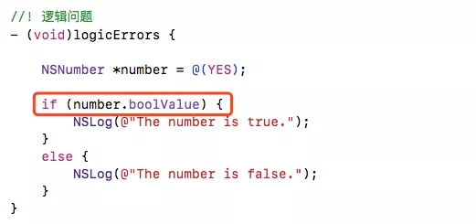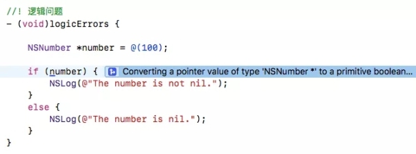 使用Analyze可以分析出来代码中潜在的逻辑问题。比如直接使用NSNumber的对象作为条件时,会得到提示Converting a pointer value of type 'NSNumber *' to a primitive boolean value; instead, either compare the pointer to nil or call -boolValue。图示如下: