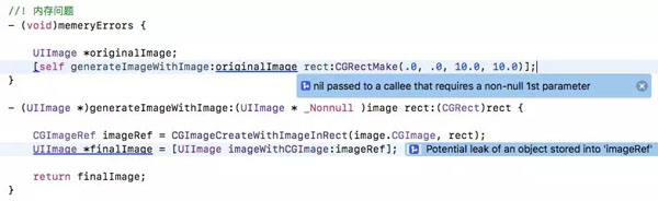 虽然ARC帮助开发者管理了大部分的内存问题。但像CGImageRef等C系列的代码还需要开发者管理内存。这些内存问题在编译过程中很难发现,但使用Analyze可以给出相应的提示。图示如下: