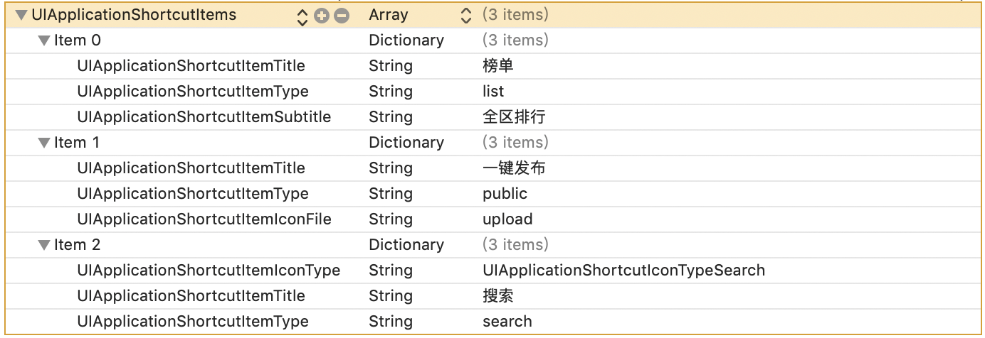 快捷方式支持在 Info.plist 里直接定义,主键是UIApplicationShortcutItems,它是一个数组Array。各个 Key 值可以在查看Information Property List Key Reference,在这里简单地介绍一下各个 Key 的作用。