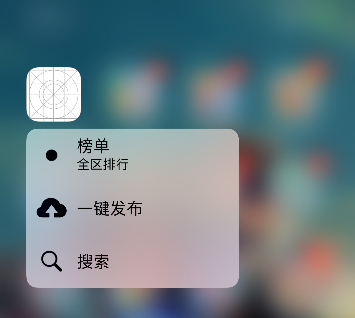 UIApplicationShortcutItem *public = [[UIApplicationShortcutItem alloc] initWithType:@"public" localizedTitle:@"一键发布" localizedSubtitle:nil icon:publicIcon userInfo:nil];