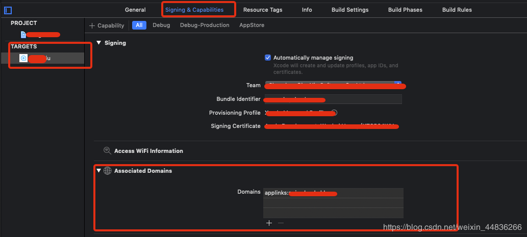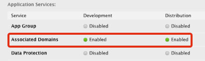 注:这里可能会遇到一个错误就是你的App ID中并没有允许使用Associated Domains,所以需要进入开发者中心,编辑App ID允许Associated Domains,并且重新生成对应的签证文件并下载安装。在最新xcode11,添加了该项,开发者账号该appId下自动打开