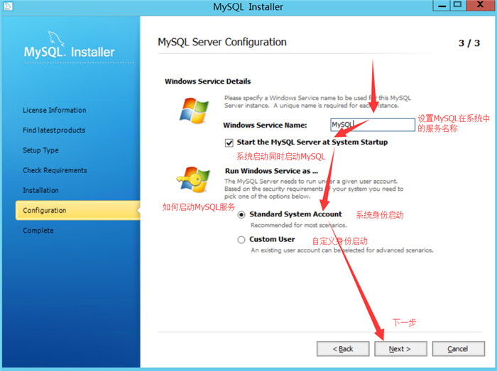 然后是配置MySQL的服务名称、是否随系统启动而自动启动、以什么身份启动等等。如图: