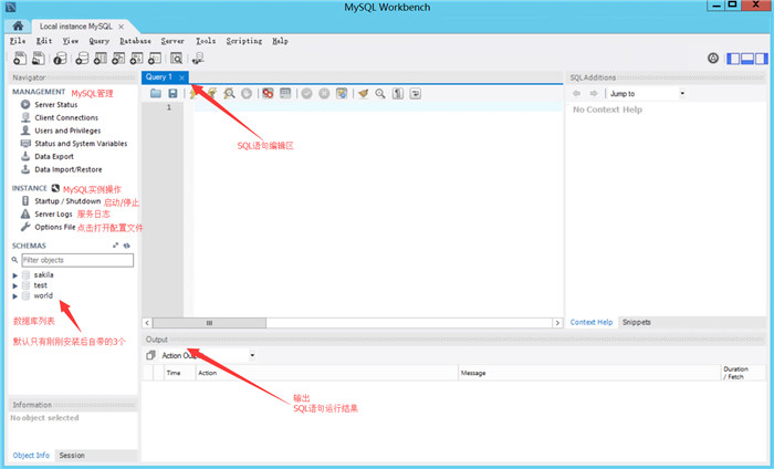 登录后,便看到了MySQL Workbench工作台的主界面了,功能相对挺完善的了。如图: