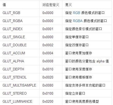 mode参数是一个GLUT库里预定义的可能的布尔组合。你使用mode去指定颜色模式,数量和缓冲区类型。