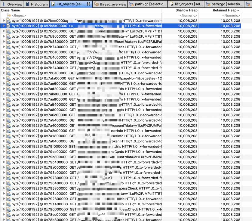 可以看到byte数组占用了接近JVM配置的最大堆的大小也就是8GB,显然这是OOM的原因。