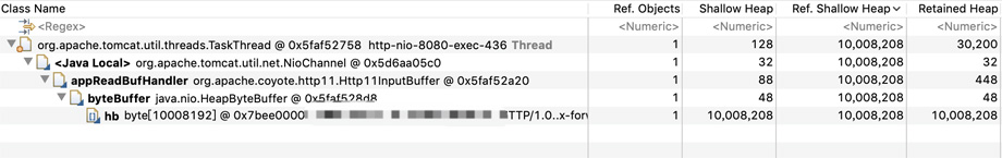 这符合之前的猜测,是tomcat的线程在处理过程中分配了10M的buffer在堆上。至此,马上可以想到一定是什么参数设置的不合理导致了这种情况,一般而言tomcat不可能为每一个请求分配如此大的buffer。