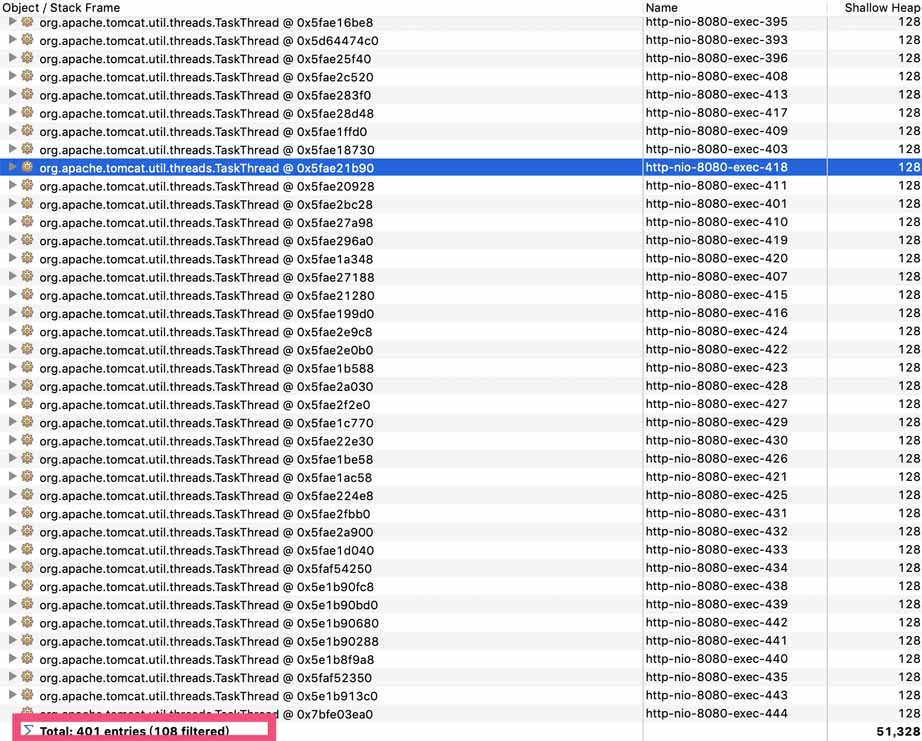 可以打开线程视图,搜索一下tomcat的工作线程,发现线程数量的确很多有401个,但是也只是800的一半: