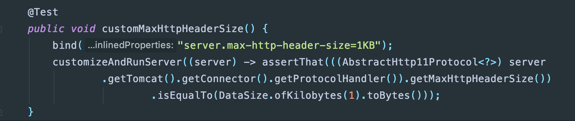 再来看看问题2,这就需要来找一下源码了,首先max-http-header-size是springboot定义的参数,查看springboot代码可以看到这个参数对于tomcat设置的是MaxHttpHeaderSize:
