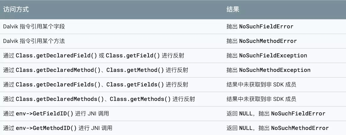 以往开发者对于非 SDK 接口的调用通常是利用反射或者JNI间接调用的方式进行,但这样的调用方式如果处理不当会比较容易出现一些未知的错误。为了提升用户体验和降低应用发生崩溃的风险,Android 9.0 对应用能使用的非 SDK 接口实施了限制,具体的限制手段请见下表:
