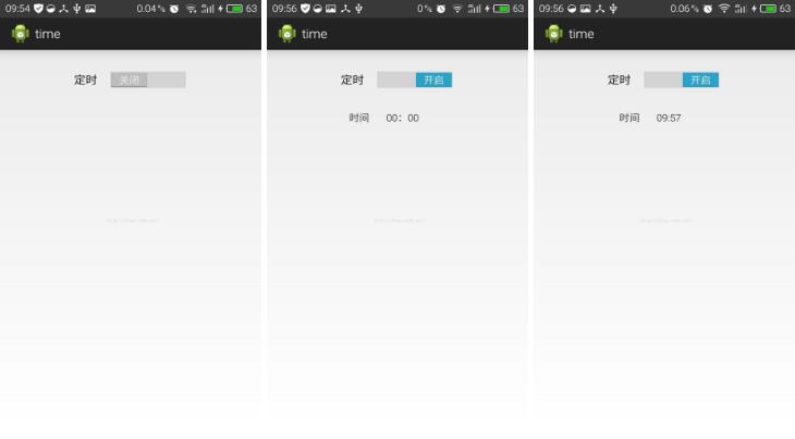 <RelativeLayout xmlns:android="http://schemas.android.com/apk/res/android" xmlns:tools="http://schemas.android.com/tools" android:layout_width="match_parent" android:layout_height="match_parent" tools:context=".MainActivity" > <Switch android:id="@+id/swOnOfOff" android:layout_width="wrap_content" android:layout_height="wrap_content" android:layout_alignParentTop="true" android:layout_centerHorizontal="true" android:layout_marginTop="30dp" android:textOn="开启" android:textOff="关闭" android:text="定时" /> <LinearLayout android:id="@+id/llSelectTime" android:layout_width="match_parent" android:layout_height="wrap_content" android:layout_marginTop="50dp" android:padding="40dp" android:visibility="gone" android:orientation="horizontal" > <TextView android:layout_width="wrap_content" android:layout_height="wrap_content" android:layout_weight="2" android:gravity="right" android:text="时间 " /> <TextView android:id="@+id/tvSelectTime" android:layout_width="wrap_content" android:layout_height="wrap_content" android:layout_weight="3" android:gravity="left" android:text="00:00" /> </LinearLayout> </RelativeLayout>