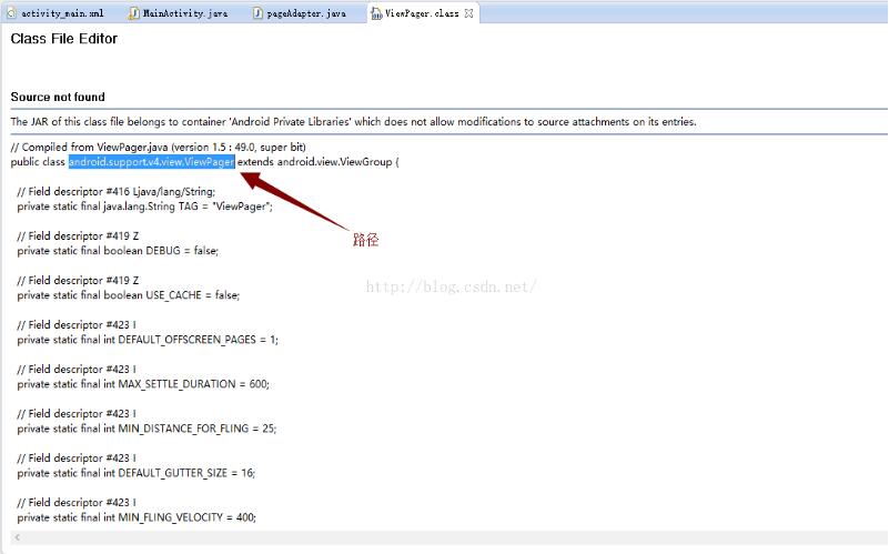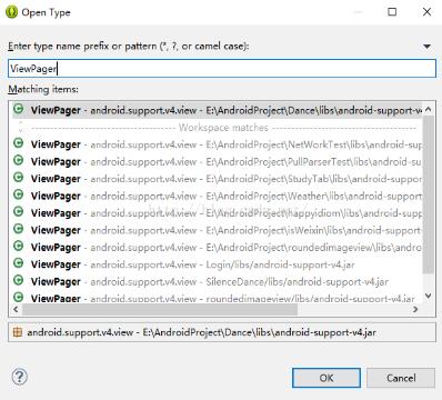 5.因为ViewPager是在jar包里,添加该控件需要写出路径,当记不住的时候,按下Ctrl+Shift+t,弹出框里输入“ViewPager”并选择,显示的页面中就包含该控件的路径。