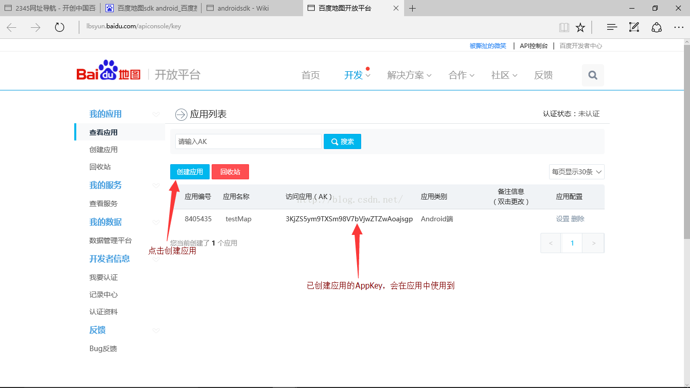 2.注册账号后,点击开发->Android地图SDK->获取密钥,进入后显示如下页面。
