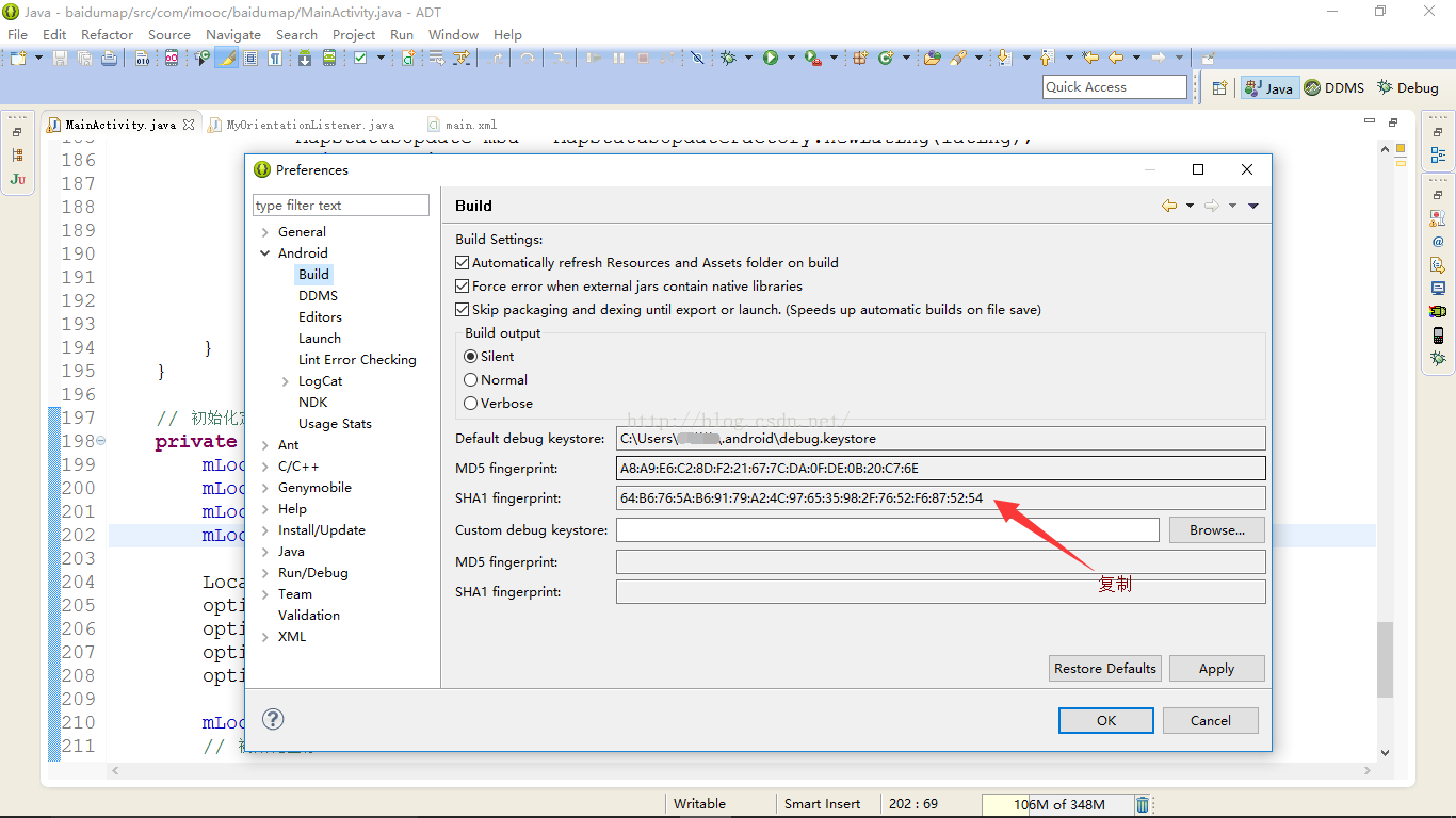 4.打开eclipse,选择Window->Preferences->Android->Build,获取SHA1