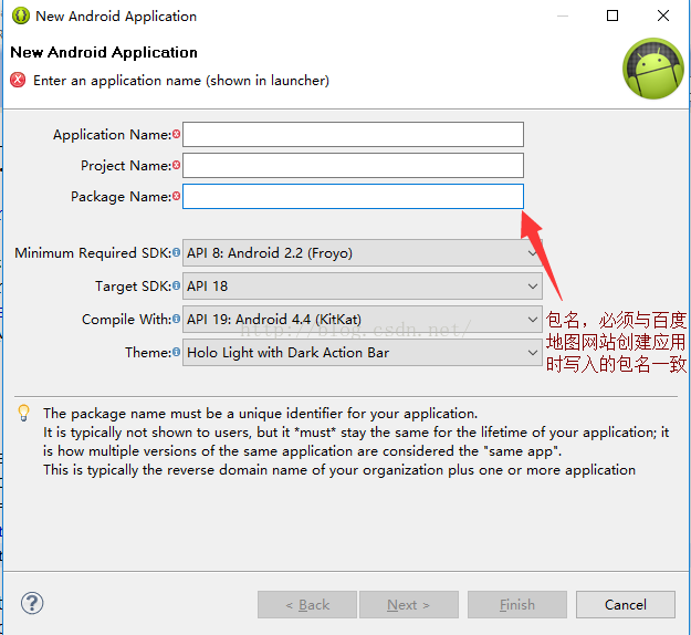 8.开始创建应用,注意创建时包名