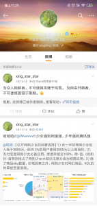 最近产品提了个新需求,需要实现点击App内的某个按钮跳转到个人详情页并且滑动到顶部,个人详情页的页面交互稍微复杂,技术角度上包含了状态栏颜色变换,view滑动联动等问题,技术实现上采用了Google出的CoordinatorLayout那套组件,由于App的个人详情页跟微博的相似,这里就拿微博为例来描述。微博默认的效果以及手动滑动到顶部的效果图如下。