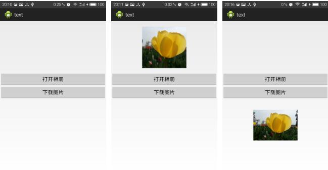 <RelativeLayout xmlns:android="http://schemas.android.com/apk/res/android" xmlns:tools="http://schemas.android.com/tools" android:layout_width="match_parent" android:layout_height="match_parent" tools:context=".MainActivity" > <ImageView android:id="@+id/ivHead" android:layout_marginTop="20dp" android:layout_centerHorizontal="true" android:layout_width="150dp" android:layout_height="150dp"/> <Button android:id="@+id/btnSelectImage" android:layout_width="match_parent" android:layout_height="wrap_content" android:layout_alignParentLeft="true" android:layout_below="@+id/ivHead" android:layout_marginTop="16dp" android:text="打开相册" /> <Button android:id="@+id/btnDownloadImage" android:layout_width="match_parent" android:layout_height="wrap_content" android:layout_alignParentLeft="true" android:layout_below="@+id/btnSelectImage" android:text="下载图片" /> <ImageView android:id="@+id/ivDownload" android:layout_width="150dp" android:layout_height="150dp" android:layout_marginTop="20dp" android:layout_centerHorizontal="true" android:layout_below="@+id/btnDownloadImage" /> </RelativeLayout>