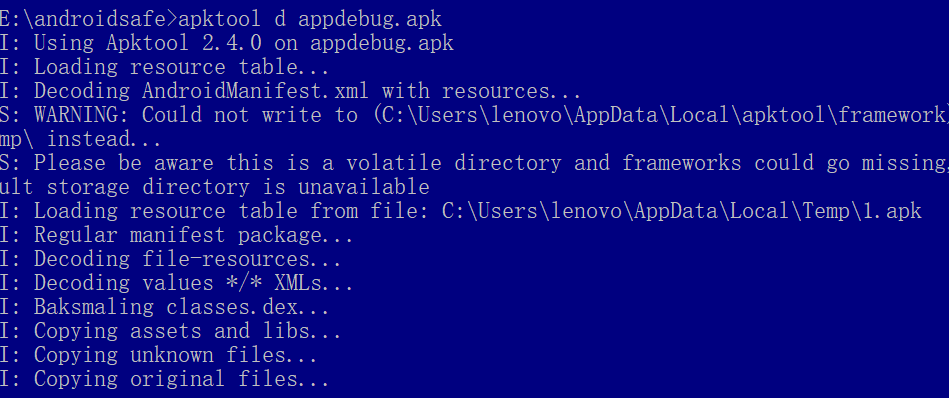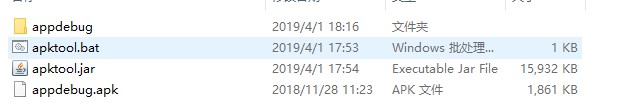 此时我们的E:/androidsafe文件夹下只有这三个文件,同时我们也需要把下载的第二个文件apktool-2.4.0.jar更改成apktool.jar,不然是无法运行这个工具的。同时把需要反编译的apk文件移动到这个文件夹下。