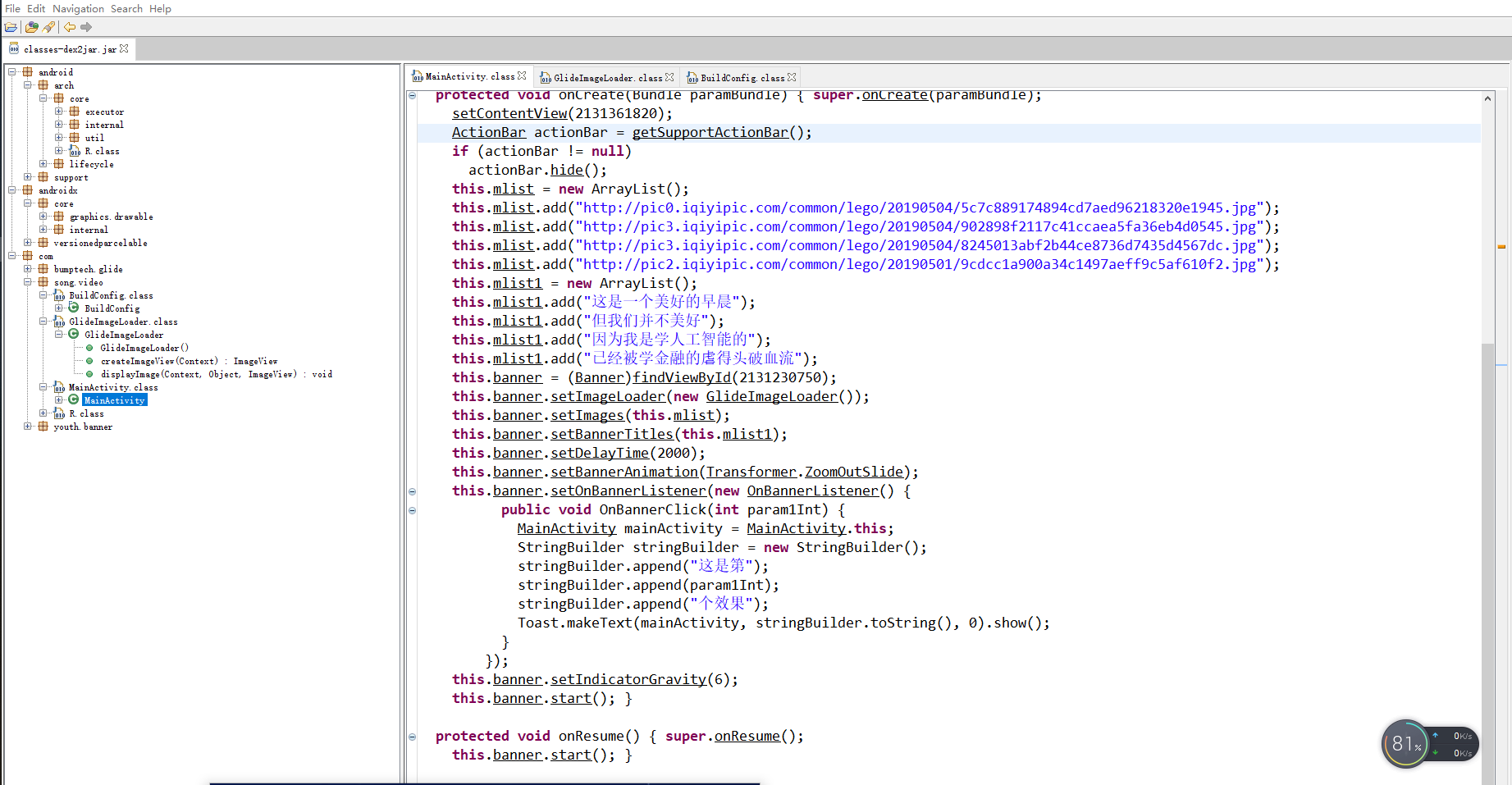 可以说是十分成功了。其中的res文件夹是程序当中的所有资源文件,smali文件夹下存放了程序所有的反汇编代码。apktool这个工具主要是用来解析资源res和资源AndroidManifest.xml的,除此之外的,我们还需要另外的工具来解析Java源码,利用下以下两个工具则可以用于解析Java源代码,它们分别是:dex2jar和jd-gui.