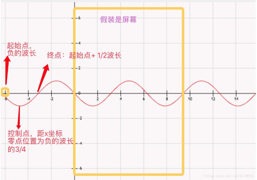 第二条曲线也可以很明显的看出来终点是在x轴的0点坐标,Y轴不变,而控制点是在负的波长的1/4的位置