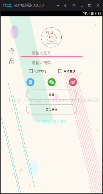 <?xml version="1.0" encoding="utf-8"?> <LinearLayout xmlns:android="http://schemas.android.com/apk/res/android" xmlns:app="http://schemas.android.com/apk/res-auto" xmlns:tools="http://schemas.android.com/tools" android:layout_width="match_parent" android:layout_height="match_parent" android:orientation="vertical" android:background="@drawable/bj" tools:context="com.example.application.MainActivity"> <ImageView android:layout_marginTop="50dp" android:layout_width="100dp" android:layout_height="100dp" android:src="@drawable/login_tx_1" android:layout_gravity="center" /> <FrameLayout android:layout_width="match_parent" android:layout_height="wrap_content"> <EditText android:layout_width="300dp" android:layout_height="wrap_content" android:layout_gravity="center" android:focusable="true" android:focusableInTouchMode="true" android:clickable="true" android:hint="请输入账号" android:gravity="center" android:paddingRight="100dp" android:id="@+id/login_uname" /> <TextView android:layout_width="38dp" android:layout_height="33dp" android:layout_marginLeft="30dp" android:padding="6dp" android:gravity="center" android:drawableLeft="@drawable/uname" /> </FrameLayout> <FrameLayout android:layout_width="match_parent" android:layout_height="wrap_content"> <EditText android:layout_width="300dp" android:layout_height="wrap_content" android:layout_gravity="center" android:focusable="true" android:focusableInTouchMode="true" android:clickable="true" android:hint="请输入密码" android:gravity="center" android:paddingRight="100dp" android:password="true" android:id="@+id/login_upass" /> <TextView android:layout_width="38dp" android:layout_height="33dp" android:layout_marginLeft="30dp" android:padding="6dp" android:gravity="center" android:drawableLeft="@drawable/upass" /> </FrameLayout> <LinearLayout android:layout_width="match_parent" android:layout_height="wrap_content" android:gravity="center" > <CheckBox android:layout_width="wrap_content" android:layout_height="wrap_content" android:text="记住密码" android:id="@+id/login_auto" /> <CheckBox android:layout_width="wrap_content" android:layout_height="wrap_content" android:layout_marginLeft="50dp" android:text="自动登录" android:id="@+id/login_btn" /> </LinearLayout> <LinearLayout android:layout_width="match_parent" android:layout_height="wrap_content" android:gravity="center" android:layout_margin="15dp" > <ImageButton android:layout_width="40dp" android:layout_height="40dp" android:src="@drawable/login_qq" /> <ImageButton android:layout_width="40dp" android:layout_height="40dp" android:src="@drawable/login_weixin" android:layout_marginLeft="60dp" /> <ImageButton android:layout_width="40dp" android:layout_height="40dp" android:src="@drawable/login_xinlan" android:layout_marginLeft="60dp" android:id="@+id/login_xinlan" /> </LinearLayout> <LinearLayout android:layout_width="match_parent" android:layout_height="wrap_content" android:orientation="vertical"> <Button android:layout_width="240dp" android:layout_height="wrap_content" android:layout_gravity="center" android:background="@drawable/a_radio_button_selector_1" android:gravity="center" android:text="登录" android:id="@+id/login_login" /> <Button android:layout_width="240dp" android:layout_height="wrap_content" android:layout_gravity="center" android:layout_marginTop="20dp" android:background="@drawable/a_radio_button_selector_1" android:gravity="center" android:text="忘记密码" android:id="@+id/login_find" /> <TextView android:layout_width="wrap_content" android:layout_height="wrap_content" android:layout_gravity="center" android:layout_marginTop="20dp" android:text="没有账号,立即注册" android:textColor="#6efafa" android:textSize="15dp" android:onClick="JumpRegister" /> </LinearLayout> </LinearLayout>