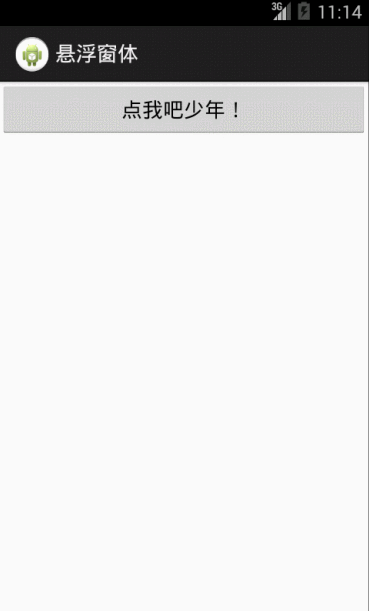 突然对悬浮窗体感兴趣,查资料做了个小Demo,效果是点击按钮后,关闭当前Activity,显示悬浮窗口,窗口可以拖动,双击后消失。效果图如下: