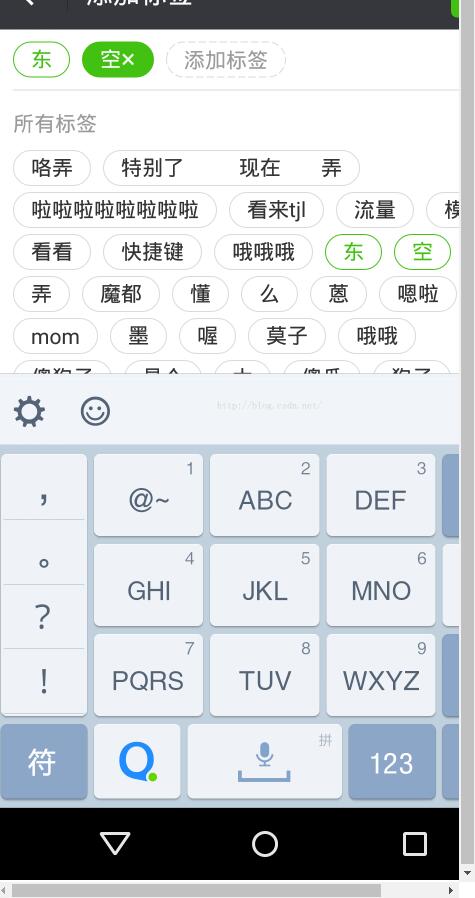 根据对微信标签的分析,这里可以这样实现,创建一个EditText,对其软键盘的Enter和Delete按键进行监听,当输入完成后按下Enter则生成一个标签,添加到LinearLayout中。然后如果当标签内文字为空时,按下删除键,就将它前一个标签的状态修改为选中状态。同样地,当点击未选择的标签也可以选中该标签进行删除。