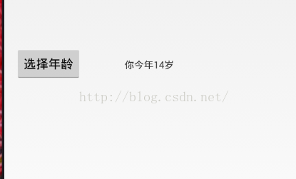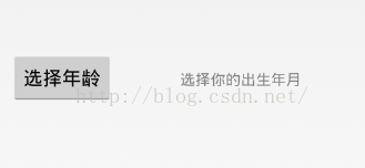 <RelativeLayout xmlns:android="http://schemas.android.com/apk/res/android" xmlns:tools="http://schemas.android.com/tools" android:layout_width="match_parent" android:layout_height="match_parent" android:paddingBottom="@dimen/activity_vertical_margin" android:paddingLeft="@dimen/activity_horizontal_margin" android:paddingRight="@dimen/activity_horizontal_margin" android:paddingTop="@dimen/activity_vertical_margin" tools:context="com.example.datepicker.MainActivity" > <TextView android:id="@+id/editText" android:layout_width="wrap_content" android:layout_height="wrap_content" android:layout_centerHorizontal="true" android:layout_centerVertical="true" android:hint="选择你的出生年月" /> <Button android:id="@+id/select" android:onClick="SelectAge" android:layout_width="wrap_content" android:layout_height="wrap_content" android:layout_alignBaseline="@+id/editText" android:layout_alignBottom="@+id/editText" android:layout_alignParentLeft="true" android:text="选择年龄" /> </RelativeLayout>