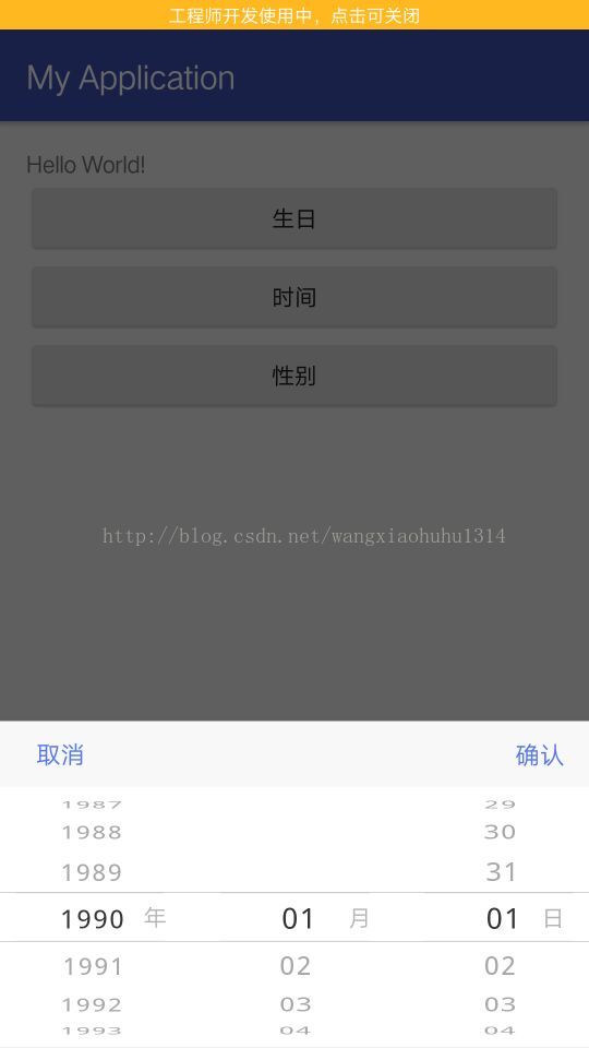 <?xml version="1.0" encoding="utf-8"?> <RelativeLayout android:id="@+id/activity_main" xmlns:android="http://schemas.android.com/apk/res/android" xmlns:tools="http://schemas.android.com/tools" android:layout_width="match_parent" android:layout_height="match_parent" android:paddingBottom="@dimen/activity_vertical_margin" android:paddingLeft="@dimen/activity_horizontal_margin" android:paddingRight="@dimen/activity_horizontal_margin" android:paddingTop="@dimen/activity_vertical_margin" > <TextView android:layout_width="wrap_content" android:layout_height="wrap_content" android:text="Hello World!" android:id="@+id/textView"/> <Button android:text="生日" android:layout_width="wrap_content" android:layout_height="wrap_content" android:layout_below="@+id/textView" android:layout_alignParentLeft="true" android:layout_alignParentStart="true" android:id="@+id/button" android:onClick="date" android:layout_alignParentRight="true" android:layout_alignParentEnd="true"/> <Button android:text="时间" android:layout_width="wrap_content" android:layout_height="wrap_content" android:layout_below="@+id/button" android:layout_alignParentLeft="true" android:layout_alignParentStart="true" android:id="@+id/button2" android:onClick="time" android:layout_alignParentRight="true" android:layout_alignParentEnd="true"/> <Button android:text="性别" android:onClick="zidingyi" android:layout_width="wrap_content" android:layout_height="wrap_content" android:layout_below="@+id/button2" android:layout_alignParentLeft="true" android:layout_alignParentStart="true" android:id="@+id/button3" android:layout_alignParentRight="true" android:layout_alignParentEnd="true"/> </RelativeLayout>