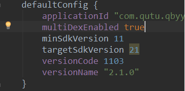 再次重新构建项目,运行发现然并卵。再次查找相关资料,资料显示每个项目的Dex都有方法数的限制(上限65536,超过上限号称应用爆棚),由此猜想会不会是Dex的方法数超过上限呢?同样报着试试的态度,在项目的build.gradle文件中添加multiDexEnabled true代码(解释:设置多Dex可用)。