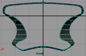 隐藏 nurbs 曲线,命令 display hide hide geometry nurbs curves , 将这些曲面移动到如 (fig 35). 回到前视窗,选择中心的物体并隐藏它们 ( 按 ctrl h)(fig 36).