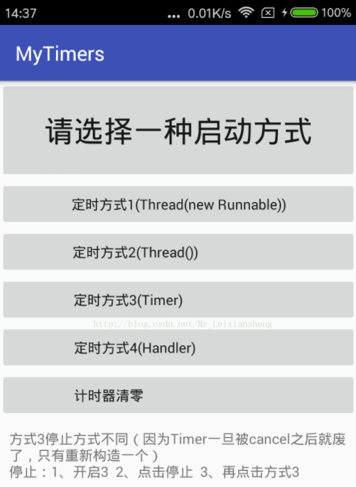 android:text="方式3停止方式不同(因为Timer一旦被cancel之后就废了,只有重新构造一个)n停止:1、开启3 2、点击停止 3、再点击方式3"