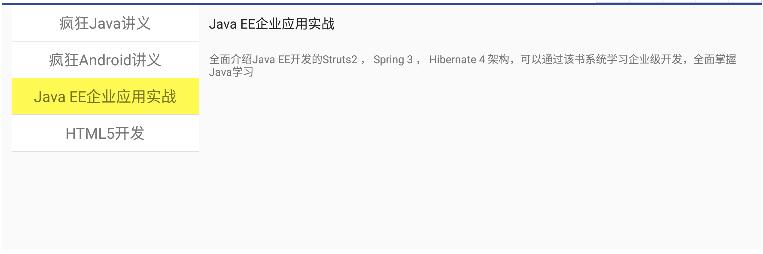 ListView的item布局和内容区Fragment的布局都比较简单,分别是一个Textview和两个Textview布局,这里不再贴出。