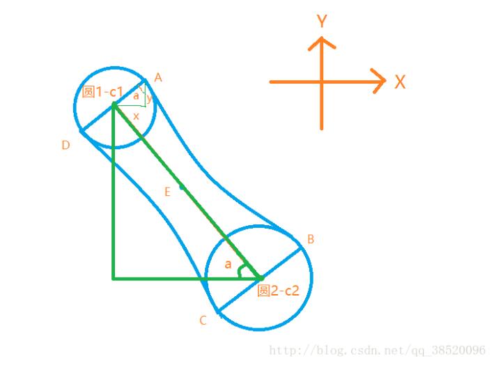 首先我们需要求出角a的大小,根据角a来求到A,B,C,D的坐标位子,然后求到控制点E点的坐标,通过Path.quadTo()方法来连接A,B和C,D两条贝塞尔曲线。