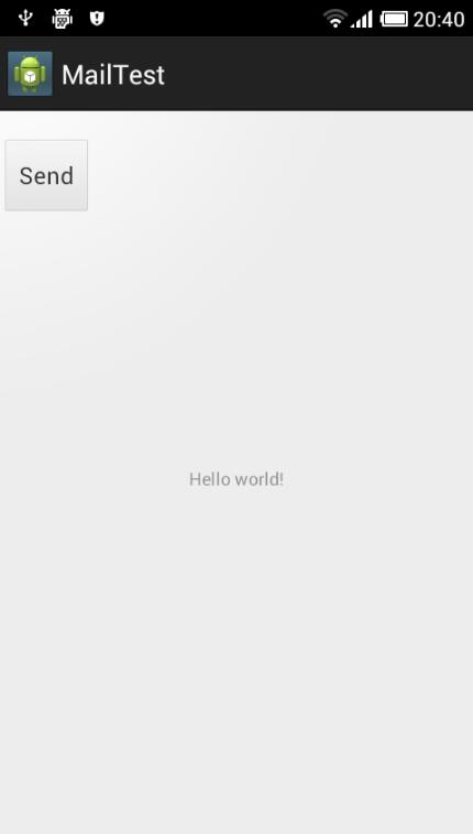 <RelativeLayout xmlns:android="http://schemas.android.com/apk/res/android" xmlns:tools="http://schemas.android.com/tools" android:layout_width="match_parent" android:layout_height="match_parent" tools:context=".MailActivity" > <TextView android:layout_width="wrap_content" android:layout_height="wrap_content" android:layout_centerHorizontal="true" android:layout_centerVertical="true" android:text="@string/hello_world" /> <Button android:id="@+id/btnSend" android:layout_width="wrap_content" android:layout_height="wrap_content" android:layout_alignParentLeft="true" android:layout_alignParentTop="true" android:layout_marginTop="19dp" android:text="Send" /> </RelativeLayout>