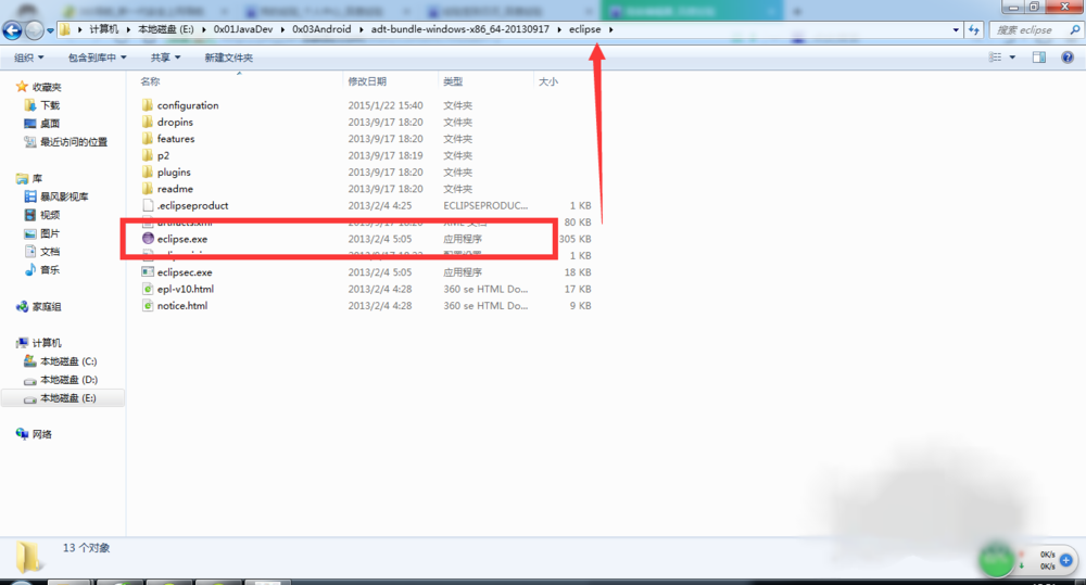2、下载好adt-bundle,并且解压之后就是上面图片的目录,我们直接打开【eclipse】文件夹,然后双击运行【eclipse.exe】就可以打开我们需要的环境了!