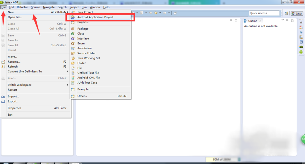 3、打开之后,我们点击菜单栏中的【File】,然后点选【New】---【Android Application Project】;选择创建Android项目;